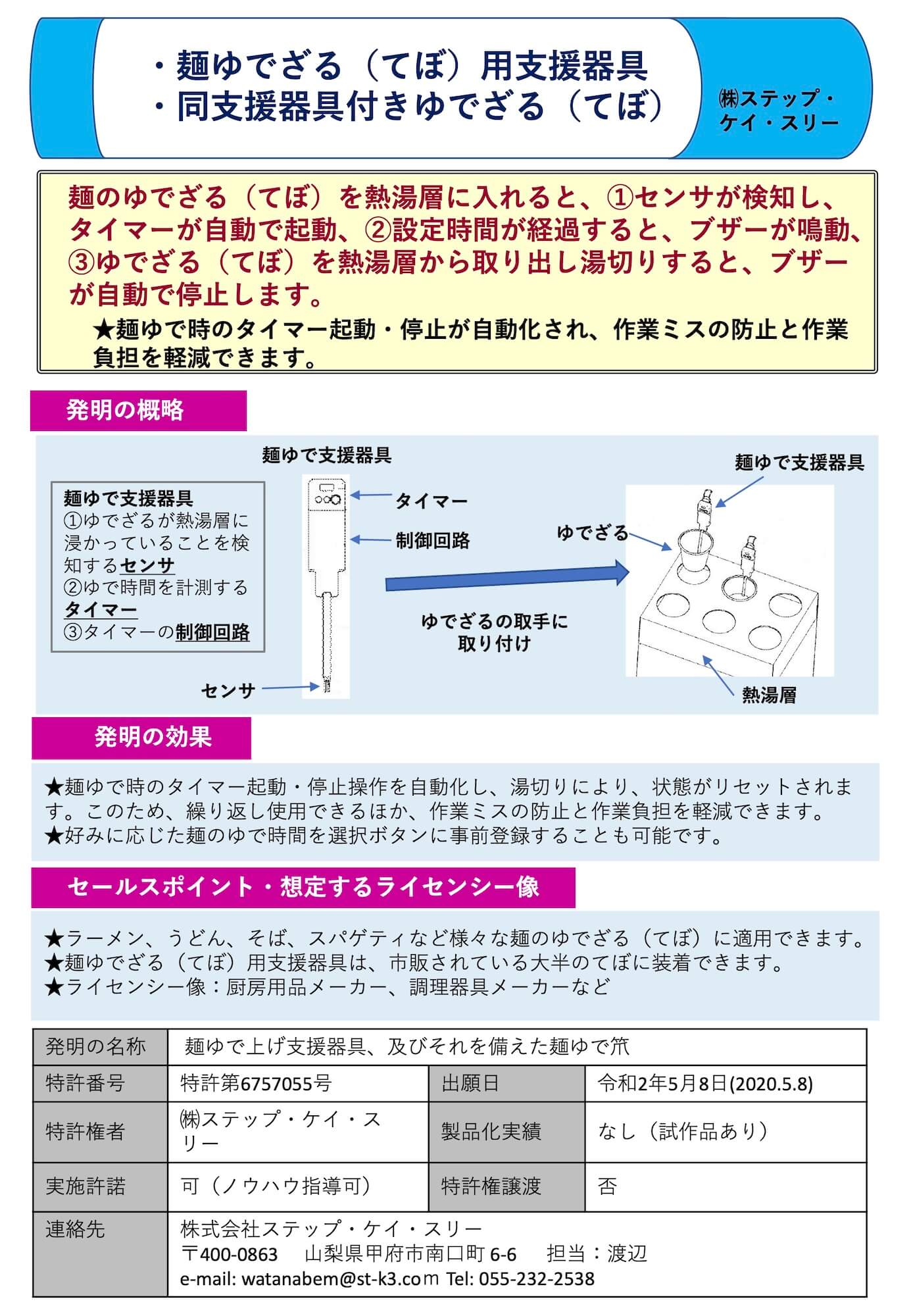| 2 | 特許6757055 | 特願2020-082353 | 2020/05/08 | 2020/09/16 | 麺ゆで上げ支援器具、及びそれを備えた麺ゆで笊 | 株式会社ステップ・ケイ・スリー |