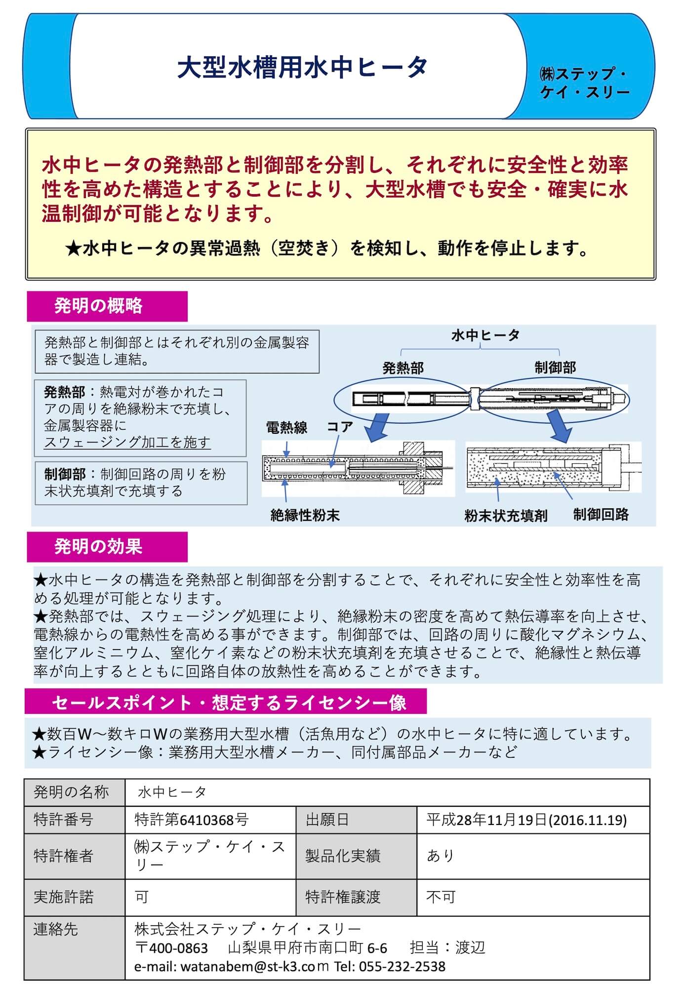| 3 | 特開2018-078872 | 特願2016-225580 | 2016/11/19 | 2018/05/24 | 水中ヒータ | 株式会社ステップ・ケイ・スリー他 |