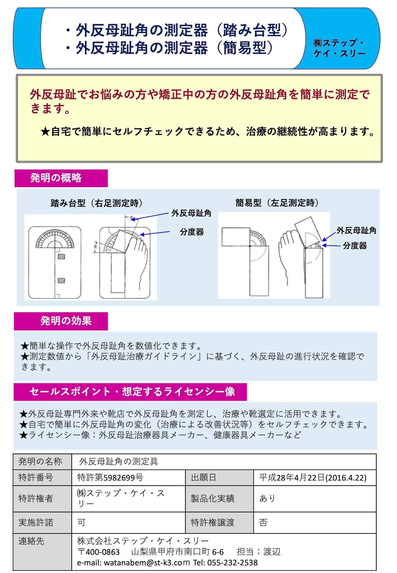 | 6 | 特許5982699 | 特願2016-085722 | 2016/04/22 | 2016/08/31 | 外反母趾角の測定具 | 株式会社ステップ・ケイ・スリー |