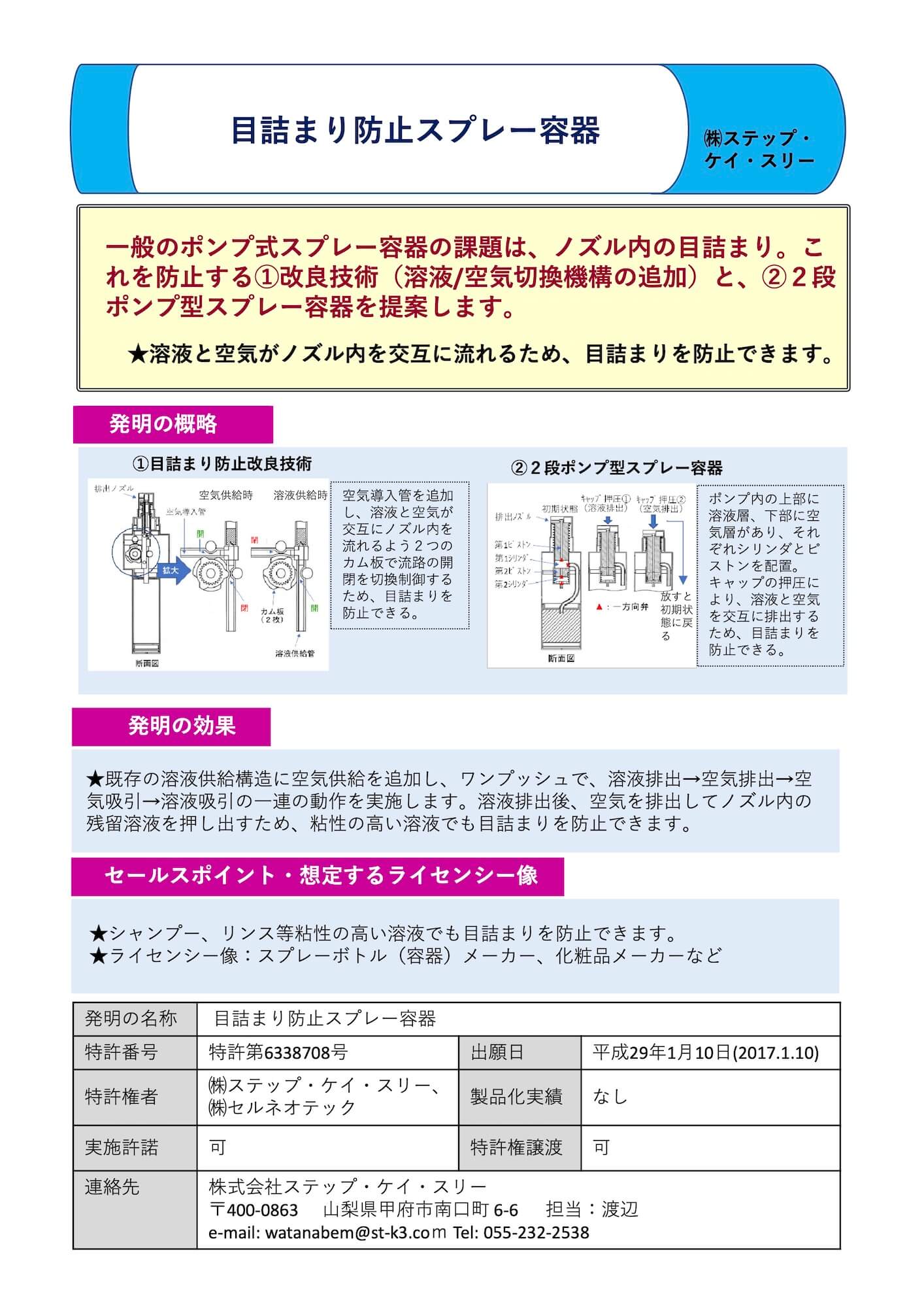 | 5 | 特開2017-154818 | 特願2017-001827 | 2017/01/10 | 2017/09/07 | 目詰まり防止スプレー容器 | 株式会社ステップ・ケイ・スリー他 |
