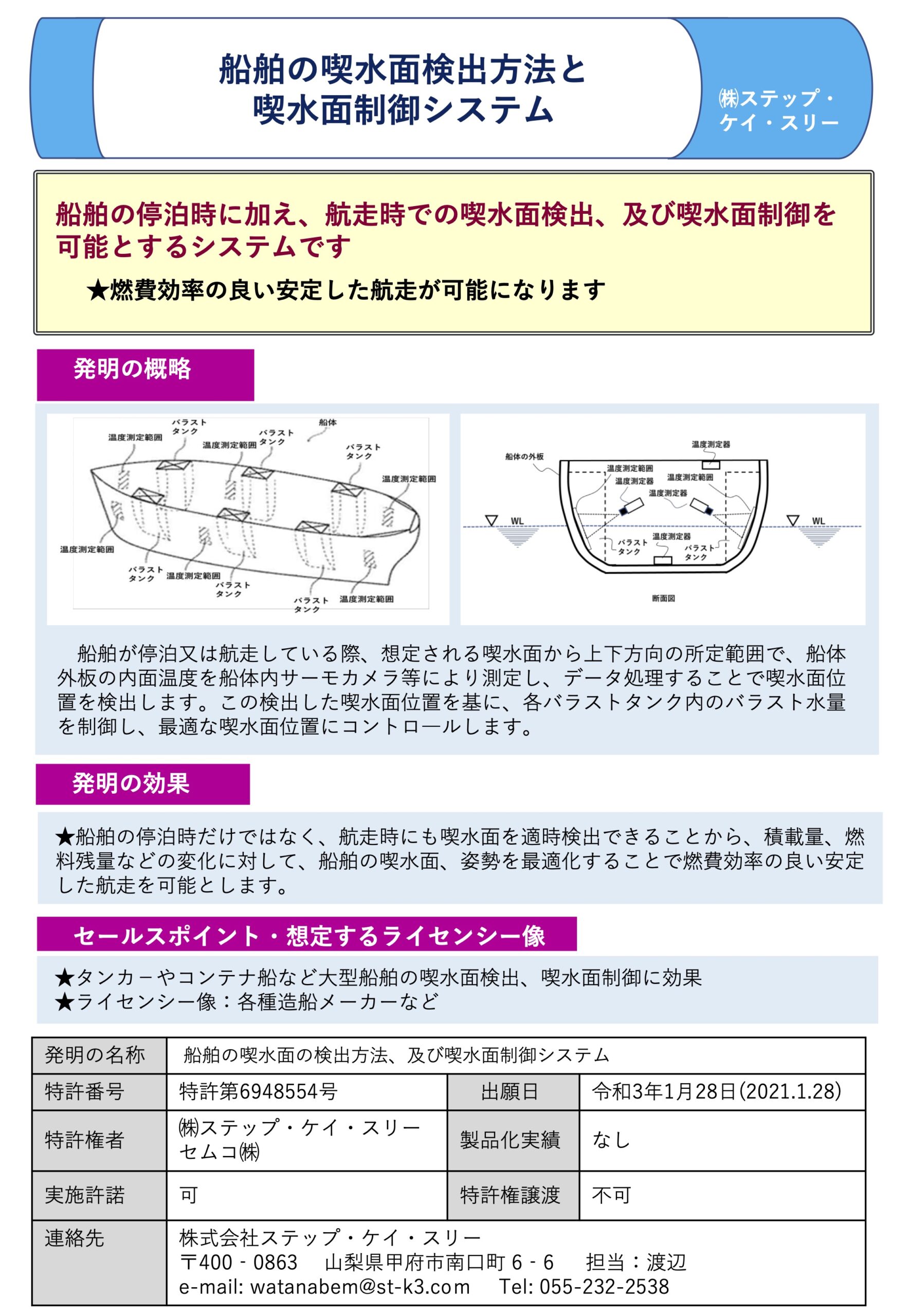 | 1 | 特許6948554 | 特願2021-012174 | 2021/01/28 | 2021/10/13 | 船舶の喫水面の検出方法、及び喫水面制御システム | セムコ株式会社他 |
